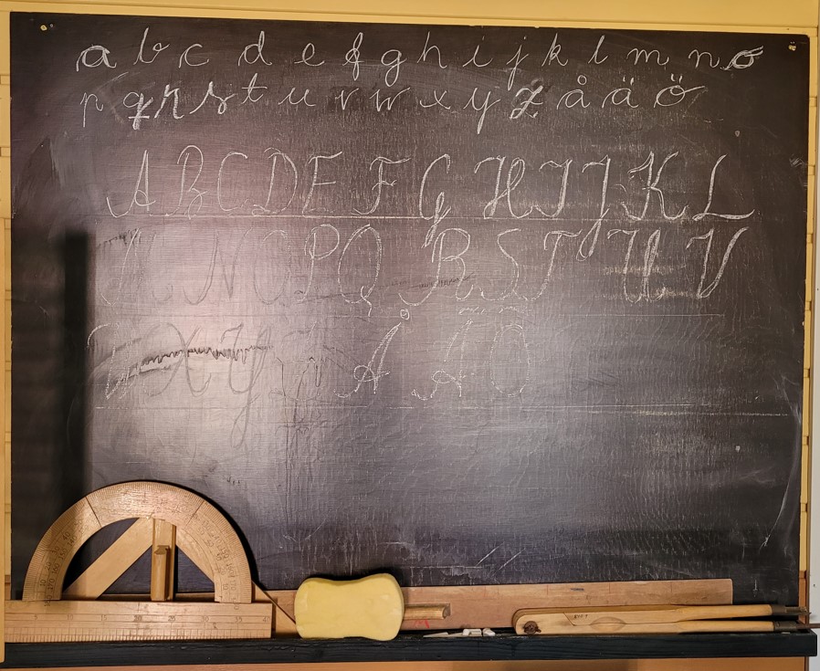 Liitutaulu ja mittavälineitä.